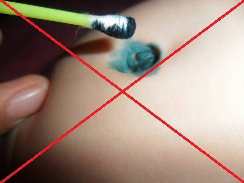 Важно помнить: не нужно обрабатывать пупок зеленкой или фукорцином! Эти красящие антисептики могут скрыть от нас характер отделяемого (кровь, гной, серозная жидкость и т.д.) и затруднить оценку состояния кожи.